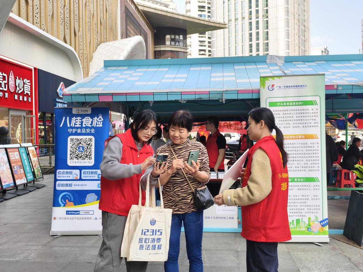活动现场,广西—东盟食品检验检测中心的青年志愿者们精神饱满、服务热情,通过设立宣传展板、发放科普手册、开展食品安全“你送我检”快速检测服务、现场答疑解惑等多种形式,向市民普及《中华人民共和国食品安全法》等法律法规及食品安全科学知识。志愿者们用通俗易懂的语言,耐心讲解如何科学选购食品、正确储存食物、识别食品标签等与日常生活息息相关的知识,帮助群众增强食品安全意识和自我保护能力。同时,志愿者们还积极引导市民扫码填写“你点我检”电子问卷,邀请大家“点”出自己关心的食品种类,通过互动参与,共同守护“舌尖上的安全”。